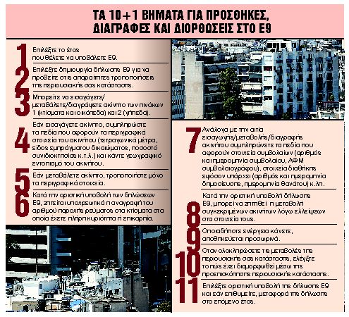 Ακόμη και αν το 2021 δεν άλλαξε η περιουσιακή σας κατάσταση, καλό είναι να ρίξετε μια ματιά στο Ε9 που θα βρείτε στην Εφαρμογή «Περιουσιολόγιο» στον προσωπικό σας λογαριασμό στο myAADE και να τσεκάρετετα στοιχεία των ακινήτων σας. Μπορεί να εντοπίσετε λάθη στα τετραγωνικά,στο ποσοστό της κυριότητας, ναέχετε ξεχάσει να δηλώσετε τον όροφο του διαμερίσματος ήτην παροχή του ηλεκτρικού ρεύματος ή να δηλώσετε ως ημιτελέςένα ακίνητο. Σημειώστε ότι οι διορθώσεις λαθών στα Ε9 γίνονται χωρίς να επιβάλλεται το πρόστιμο 100 ευρώ.
